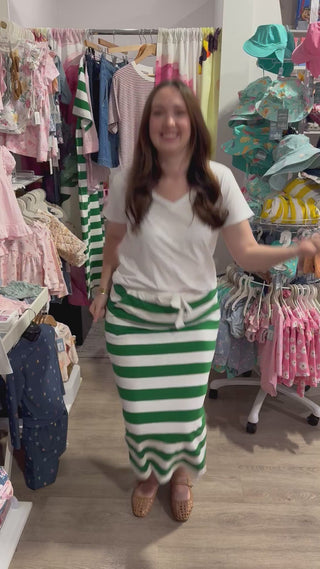Bring a touch of sporty chic to your summer wardrobe with the Foxwood Skirt Tallow – Green & White Stripe. Crafted from soft cotton jersey, this midi skirt combines everyday comfort with bold style. The elastic waistband and drawstring make it perfect for all-day wear, while the classic stripe design gives it a fresh, modern edge. Available online and in-store at Pink Poppies Living Creatively — your Stanthorpe boutique for effortless Australian fashion.