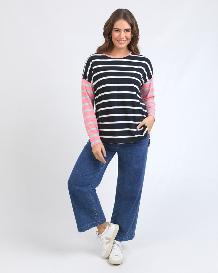 Add a playful pop of colour to your everyday wardrobe with the Elm Tee L/S Marta Stripe - Charm Pink & Navy Stripe. Featuring a bold combination of navy and white stripes with contrasting charm pink and soft blue sleeves, this long-sleeve tee is the perfect balance of fun and casual style. Crafted from soft, breathable cotton, it’s a comfortable staple that’s perfect for layering or wearing on its own through the seasons.