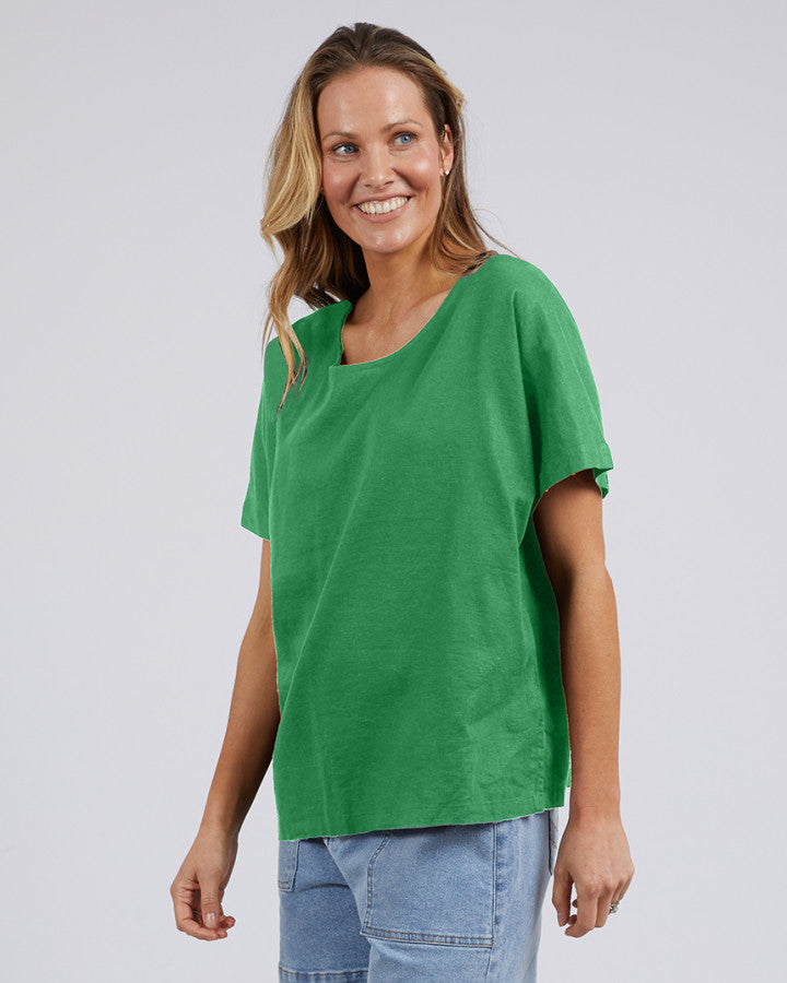 Elevate your everyday style with the Elm Curtis Woven Short Sleeve Tee in Green Briar—a perfect blend of comfort and timeless design.