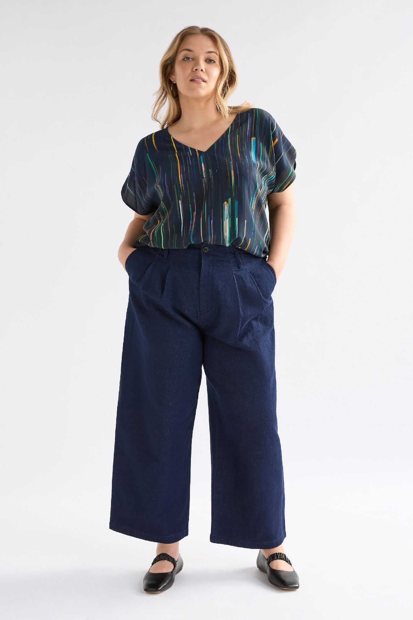 The ELK Top Kayra V Neck - Alinea Print brings a refined edge to everyday dressing with its fluid silhouette and bold, artistic print. Featuring ELK’s exclusive Alinea design — vibrant linear strokes in jewel tones set against deep navy — this lightweight V-neck top adds polish to workwear and ease to weekend looks.