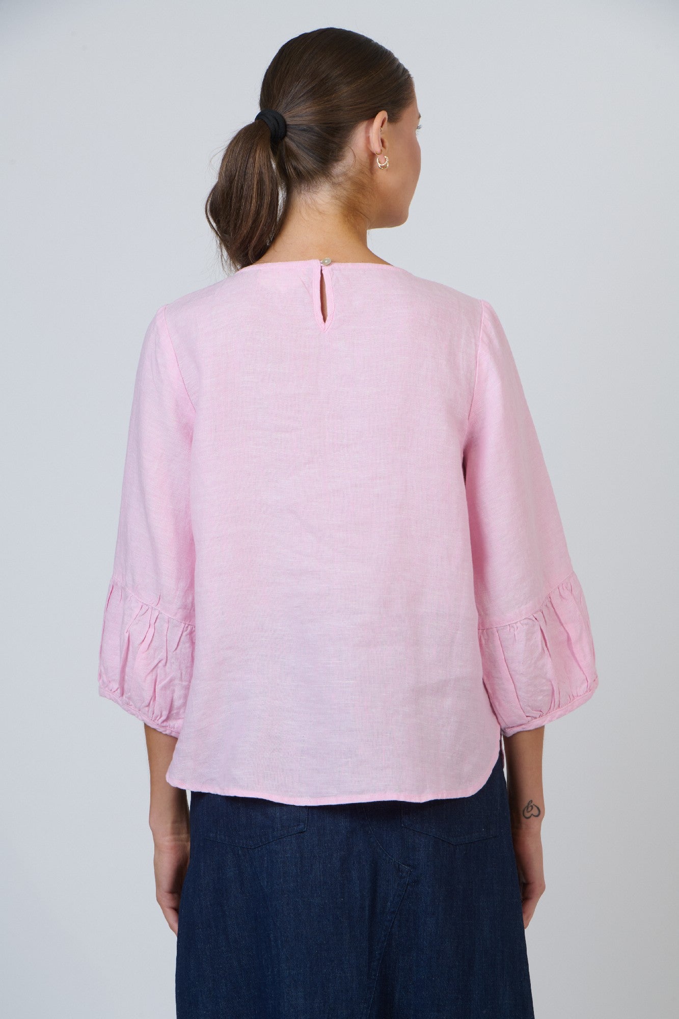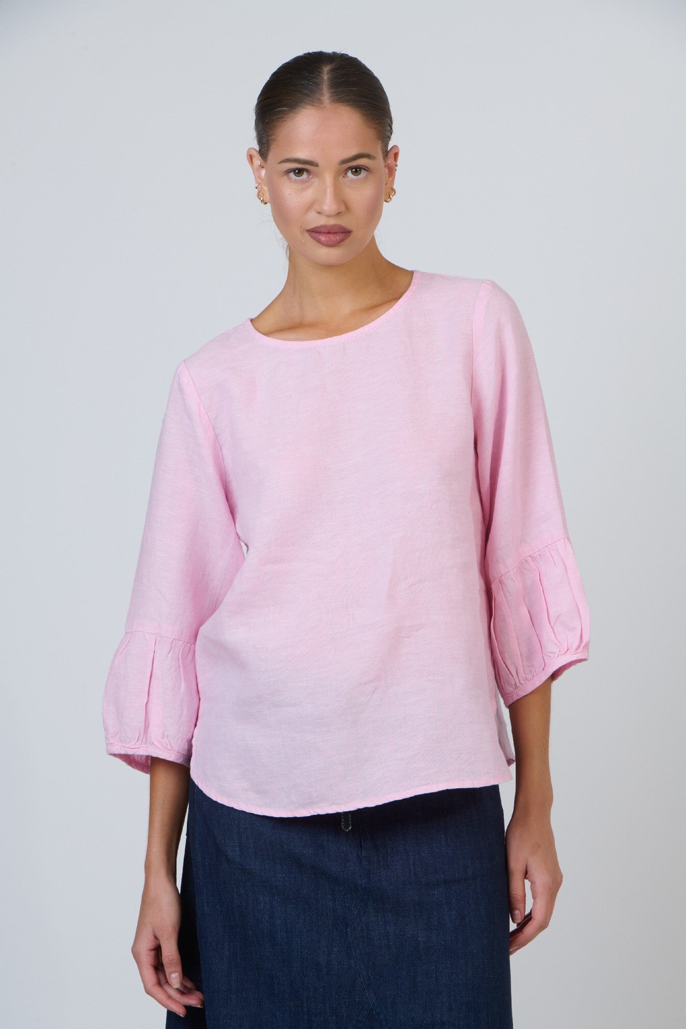 Refined simplicity meets feminine charm in the Naturals by O&J Blouse – Rash Pink. Crafted from 100% breathable linen, this softly structured blouse features a clean round neckline and voluminous three-quarter sleeves gathered into gentle cuffs. The relaxed drape and subtle texture bring an understated elegance to this timeless design, adding a fresh pop of colour to the Naturals capsule. Available online from Pink Poppies Living Creatively.
