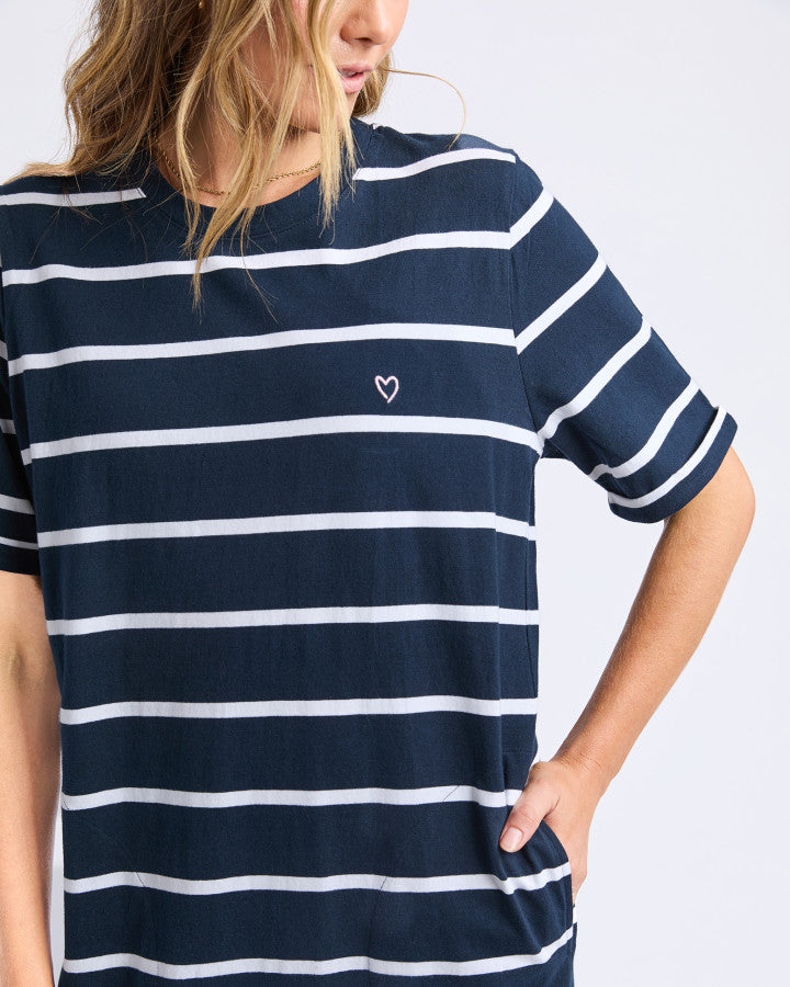 Easy, relaxed and effortlessly cool, the Elm Dress Halli – Navy Stripe is the kind of throw-on style that makes summer dressing simple. Crafted in Elm’s soft cotton jersey, this midi T-shirt dress delivers everyday comfort with that signature Elm spirit we know our Pink Poppies customers love. The Halli has been a much loved tee and now Elm brings us the Halli Tee Dress with that same great design we all love and the cutest small embroidered heart which is signature Elm. Available online from Pink Poppies Living Creatively and a reliable go-to for Granite Belt warm days.