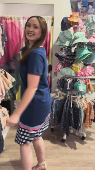 Easy, casual, and fun, the Elm Tee Dress Sylvia – Blue Depths is a relaxed everyday style you’ll wear on repeat. Made from soft cotton jersey, this navy tee dress features a flattering V-neckline, short sleeves, and contrast stripe detail at the hemline for a fresh pop of colour.