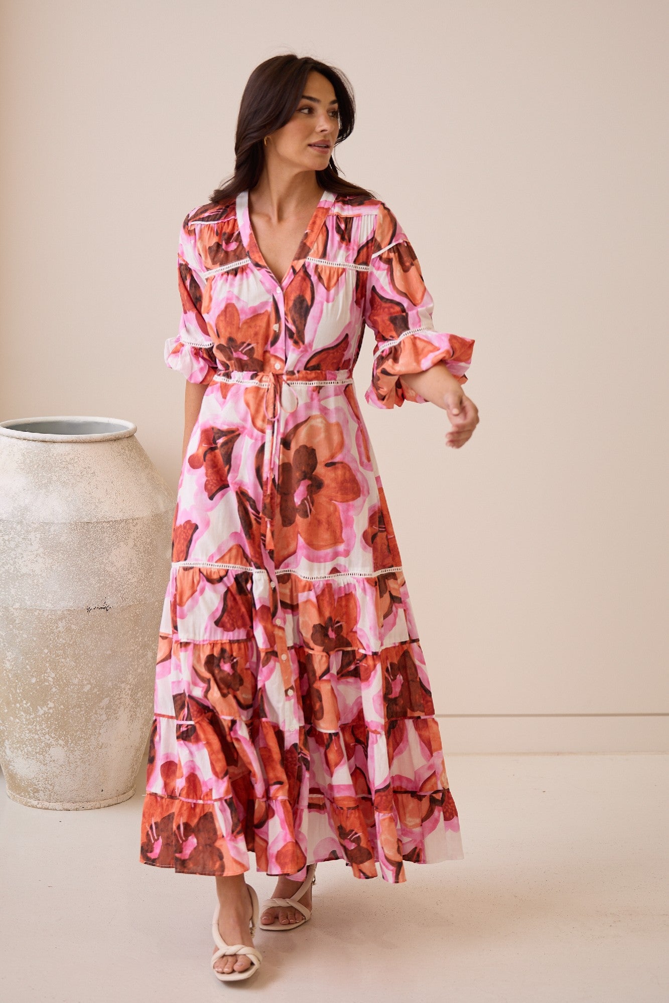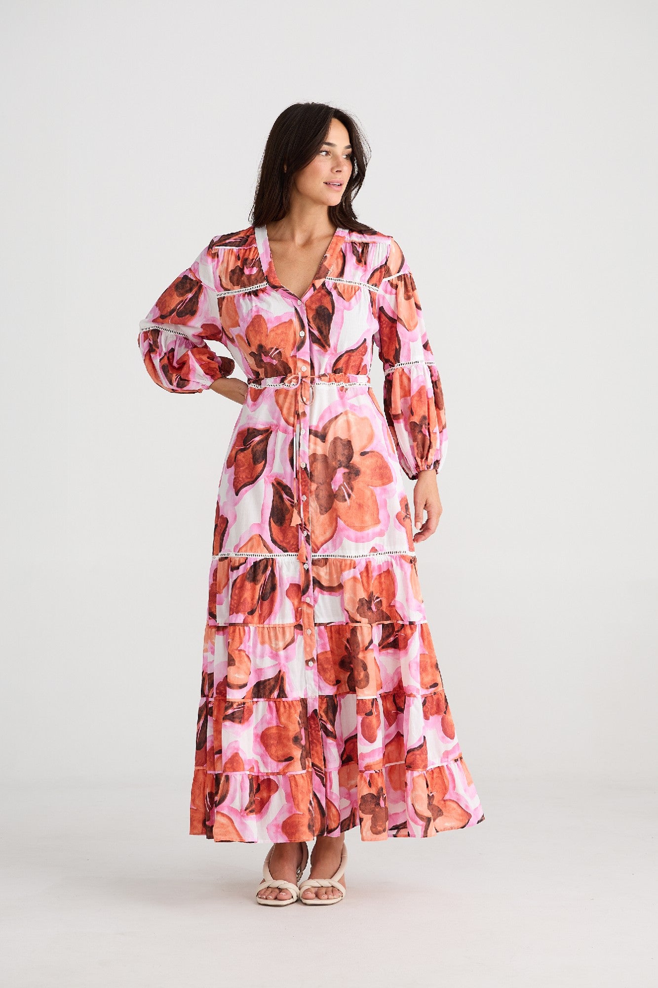 Elegant, feminine, and effortlessly flattering, the Brave & True Dress Gertie – Azalea is a standout piece that blends style and comfort in equal measure. Crafted from 100% cotton, this full-length dress features a tiered skirt, delicate ladder trim detailing, and a waist tie to define the silhouette. With side pockets and a button-through front, it’s the perfect combination of sophistication and everyday ease.