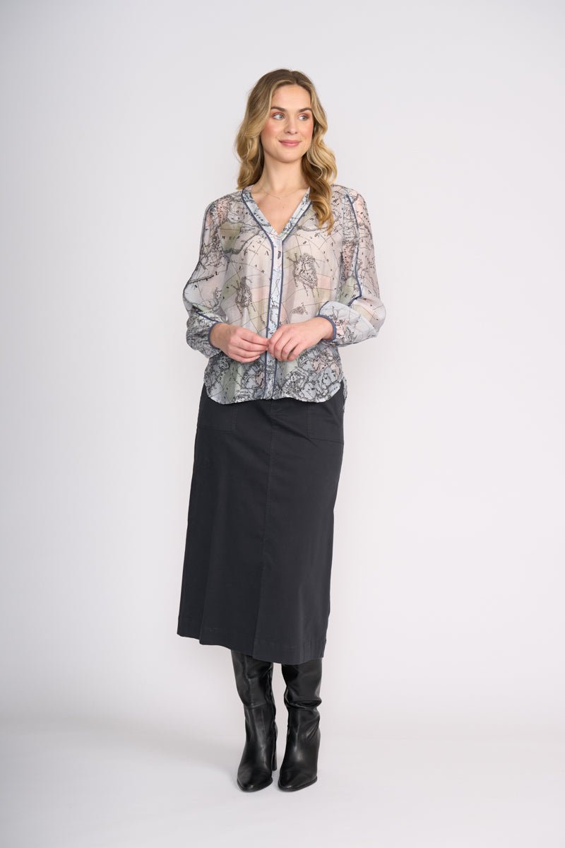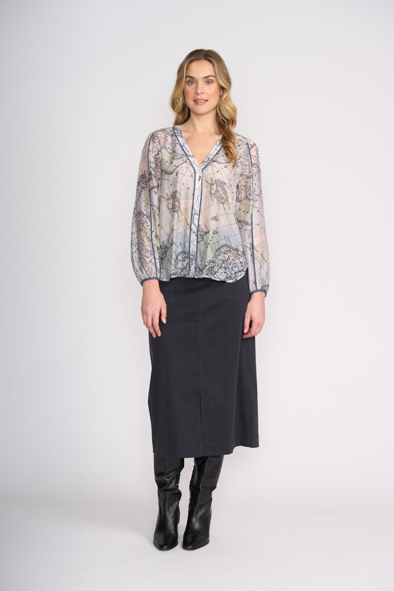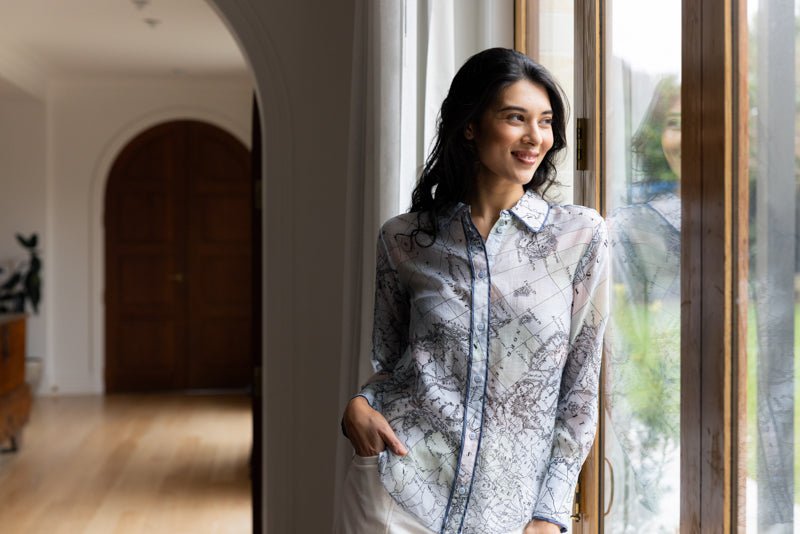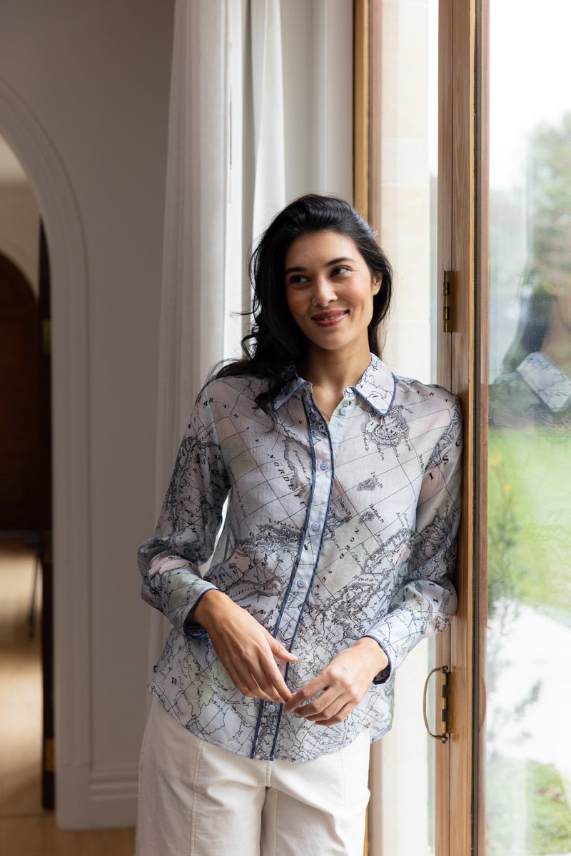 The Foil Pipe Up Shirt – Globe is a refined statement blouse that blends soft drape with a sophisticated, travel-inspired print. Designed by Foil NZ and available online from Pink Poppies Living Creatively, this lightweight shirt features an elegant globe map print in soft muted tones, finished with contrast piping detail for a polished edge. It’s the kind of piece that elevates everyday dressing while still feeling effortless and wearable for real life.