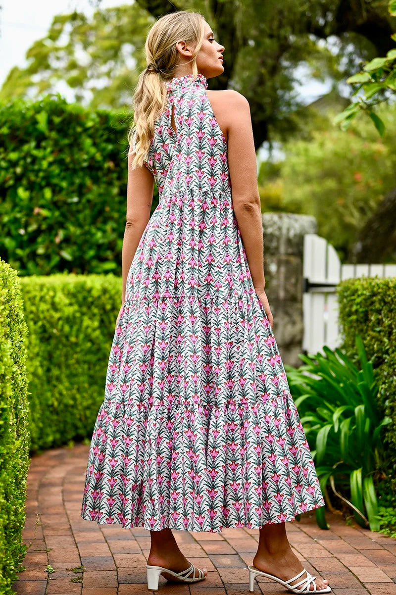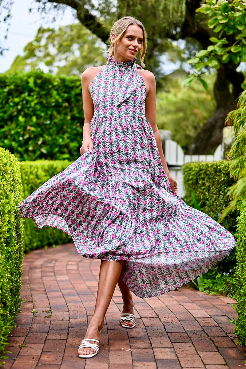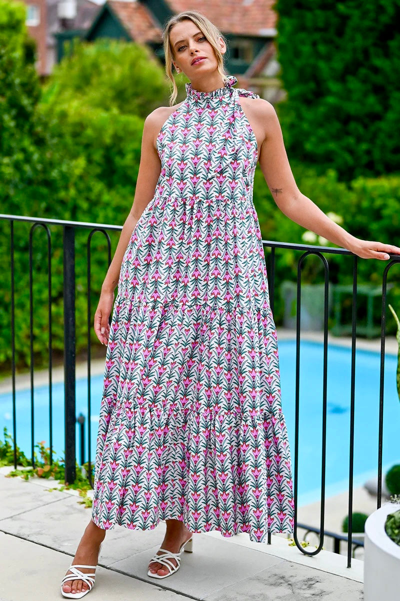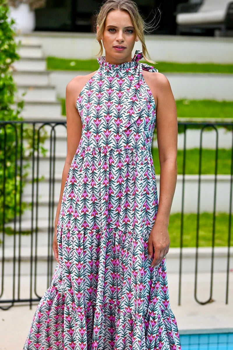 The Wyatt Wylde Helena Dress in Pink Vine is a stunning new take on the brand’s signature silhouette. This eye-catching maxi dress features a high collar with a side tie, adding a touch of refinement and femininity. Designed with a fitted bodice that gracefully flows into a trapeze silhouette, this dress offers effortless movement while maintaining an elegant shape. Crafted from crisp and breathable cotton-poplin, the Helena Dress is lightweight, comfortable, and perfect for warm-weather occasions.
